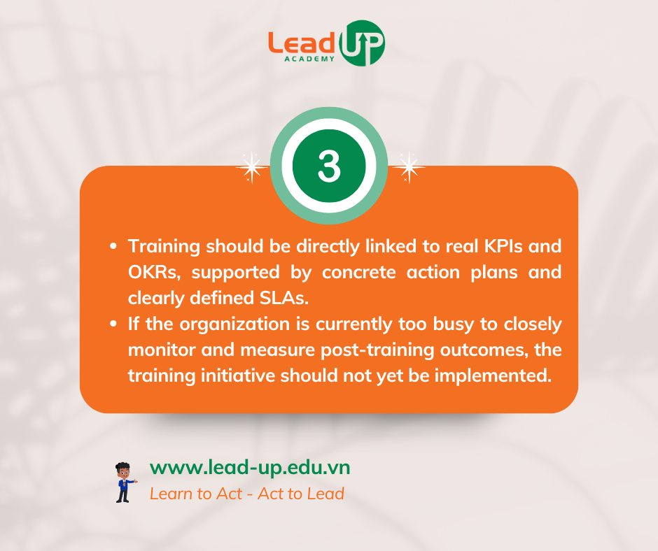 A key finding from Lead-UP Academy’s R&D activities is that if an organization lacks the capacity to monitor and measure post-training outcomes, it should not proceed with training.
