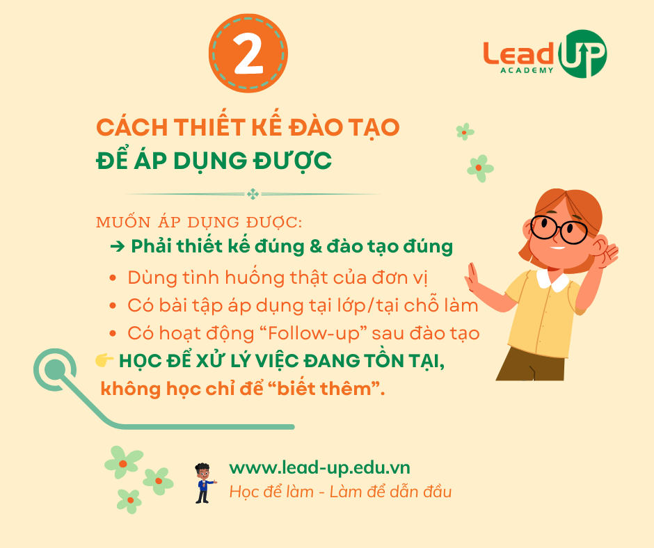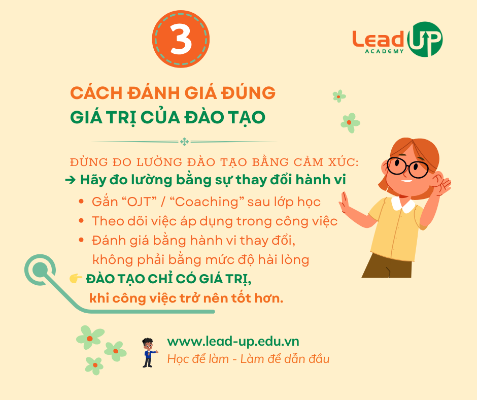 Từ góc nhìn học thuật về L&D, đào tạo cần được xem là một can thiệp có chủ đích nhằm cải thiện hiệu suất công việc, chứ không đơn thuần là một sự kiện giáo dục. Các chương trình đào tạo cần làm rõ điều gì đang không hiệu quả, nguyên nhân của vấn đề nằm ở đâu và những hành vi cụ thể nào cần thay đổi sau quá trình học tập. Khi đào tạo không trực tiếp trả lời được các câu hỏi này, khả năng tạo ra tác động thực chất sẽ bị hạn chế nghiêm trọng.