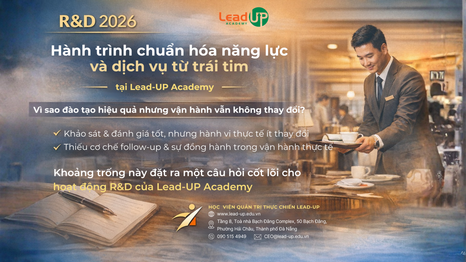 Hành trình chuyển hóa từ Đào tạo đến Vận hành hàng ngày và Dịch vụ từ Trái tim là kết quả của quá trình R&D liên tục tại Lead-UP Academy, dựa trên thực tiễn doanh nghiệp tại Việt Nam. Cách tiếp cận này không phủ nhận vai trò của đào tạo, mà đặt đào tạo vào đúng vị trí của nó: điểm khởi đầu cho sự thay đổi, chứ không phải đích đến cuối cùng.