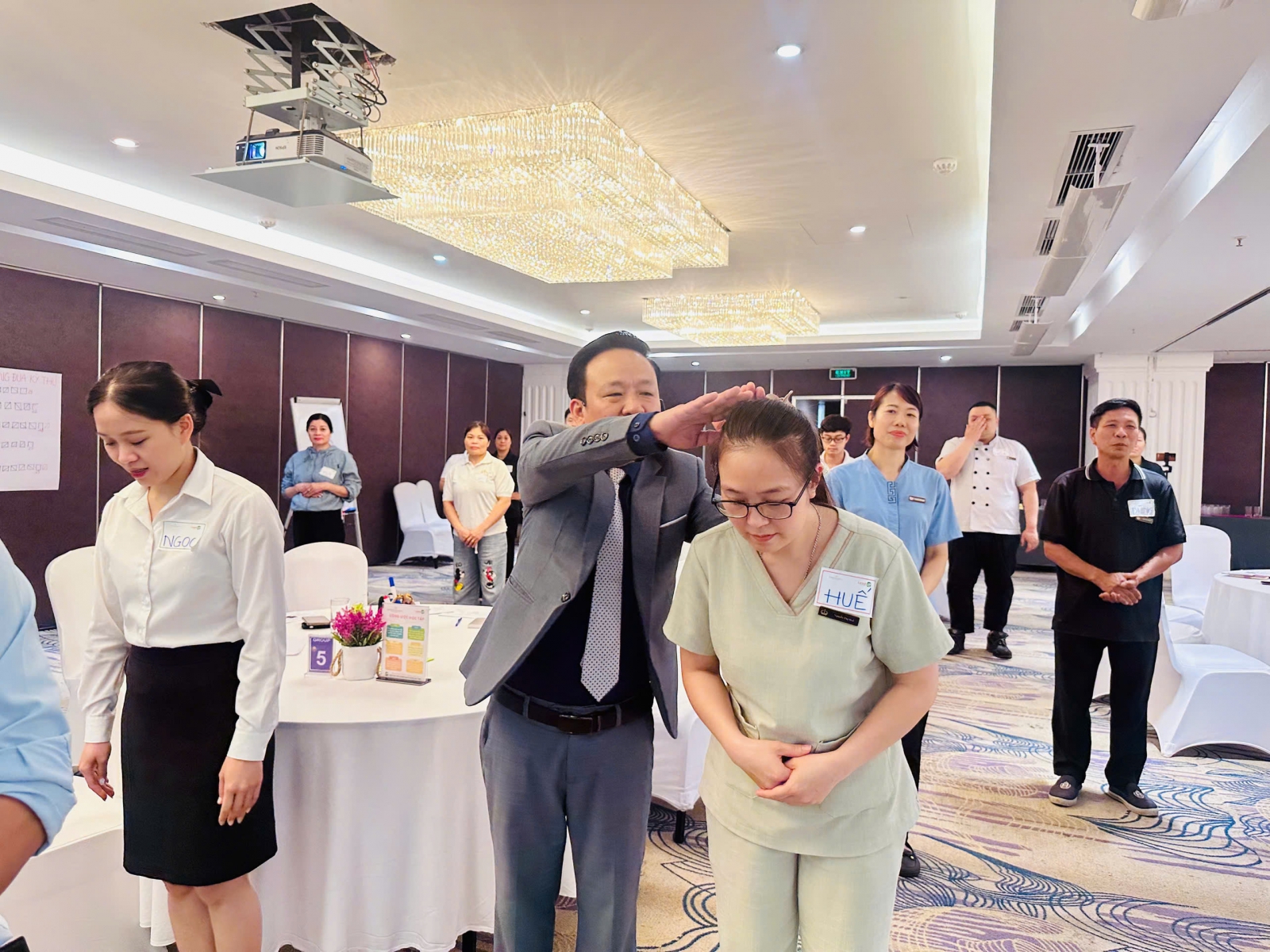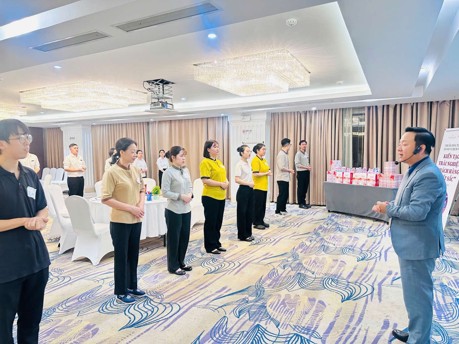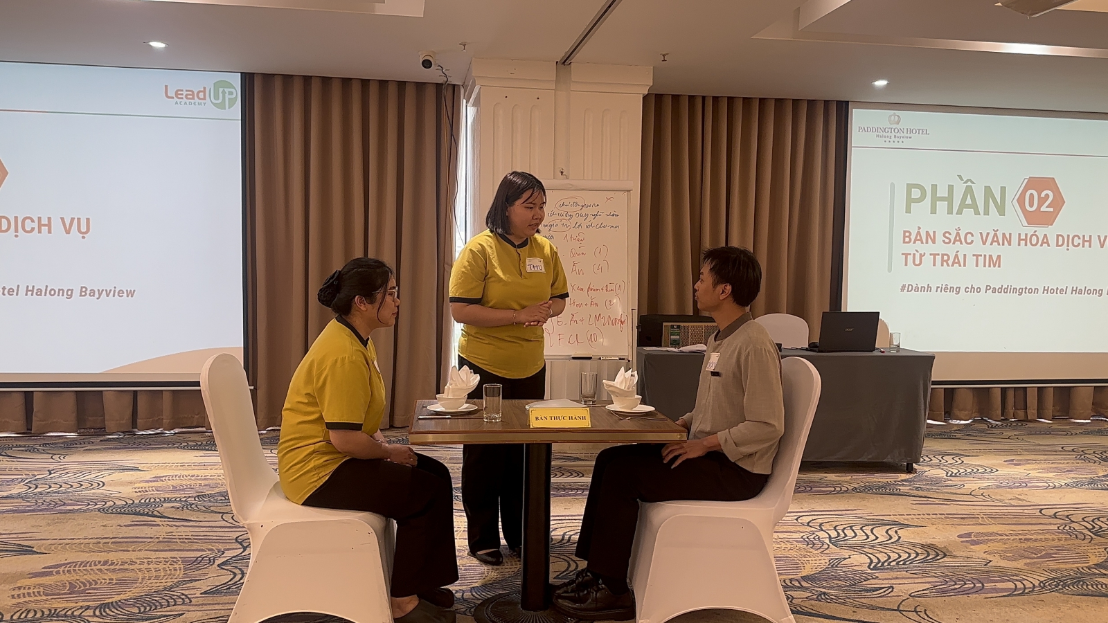 Lớp học ghi nhận sự tham gia tích cực của đội ngũ nhân sự tuyến đầu – những người trực tiếp tương tác với khách hàng tại từng thời điểm quan trọng trong hành trình trải nghiệm. Không khí lớp học diễn ra sôi nổi, thực tế và mang tính ứng dụng cao. Nội dung không dừng lại ở việc truyền tải kiến thức, mà tập trung vào việc giúp học viên nhìn lại chính mình trong từng hành động phục vụ, từ đó điều chỉnh theo chuẩn mực chung của Khách sạn. Từ các quy tắc dịch vụ đến các hành vi dịch vụ chuẩn mực đã được tạo dựng và thực hành, sửa sai ngay trên lớp học với sự hướng dẫn của Chuyên gia Phạm Tô Hoài và Lê Thị Ngọc Huyền của Học viện Quản trị Thực chiến Lead-UP.
